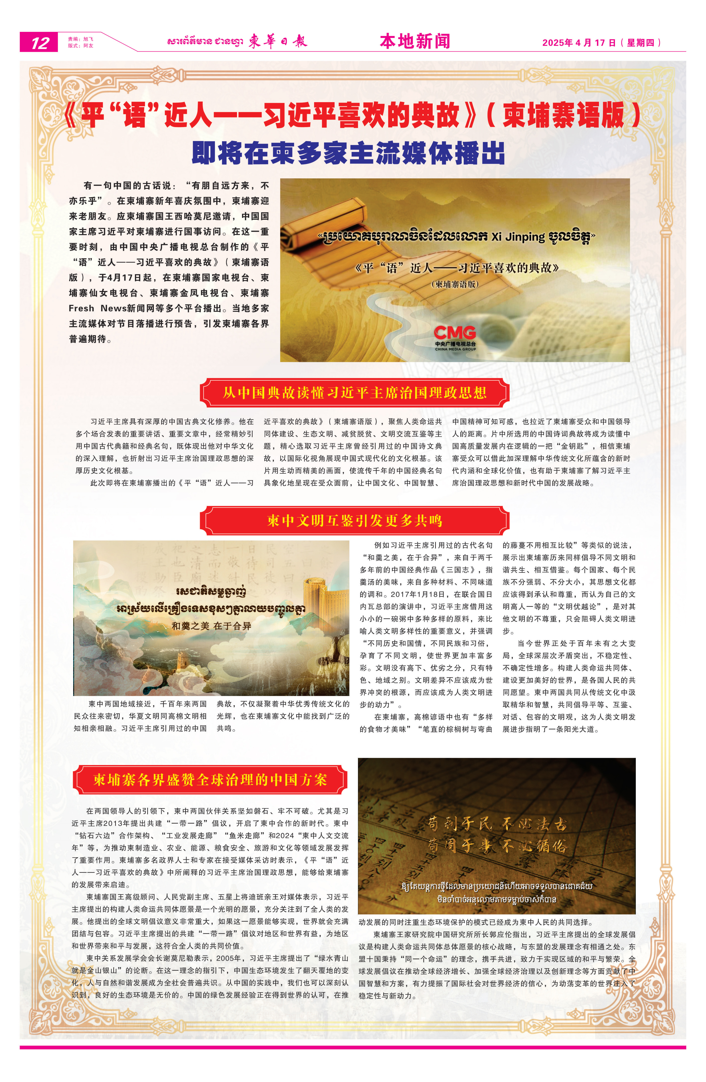4月12日至17日,《柬華日報》《大都市報》等當?shù)貓蠹埧l(fā)節(jié)目播出預告消息。文章指出,《平“語”近人——習近平喜歡的典故》(柬埔寨語版)是一把讀懂中國高質量發(fā)展內在邏輯的“金鑰匙”,相信柬埔寨受眾可以通過這些中國古籍和經(jīng)典名句加深理解中華優(yōu)秀傳統(tǒng)文化所蘊含的新時代內涵和全球化價值,了解習近平主席治國理政思想和新時代中國的發(fā)展戰(zhàn)略。