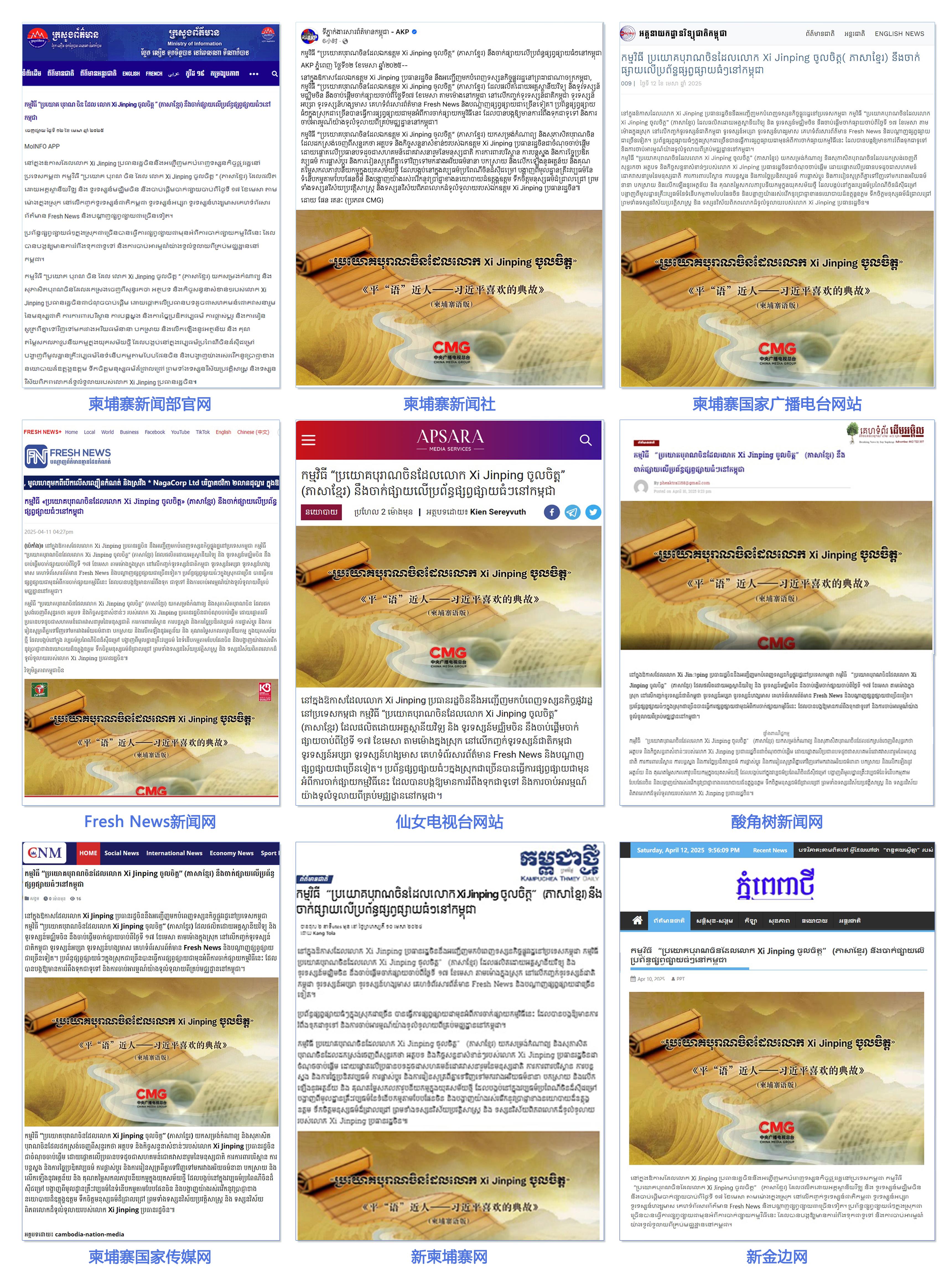 柬埔寨新聞部官網(wǎng)、柬埔寨新聞社、柬埔寨國家廣播電臺網(wǎng)站、Fresh News新聞網(wǎng)、仙女電視臺網(wǎng)站、柬中記協(xié)網(wǎng)站、酸角樹新聞網(wǎng)、柬埔寨國家傳媒網(wǎng)、新柬埔寨網(wǎng)、新金邊網(wǎng)、《金邊日報》網(wǎng)等柬主流媒體發(fā)布相關報道。