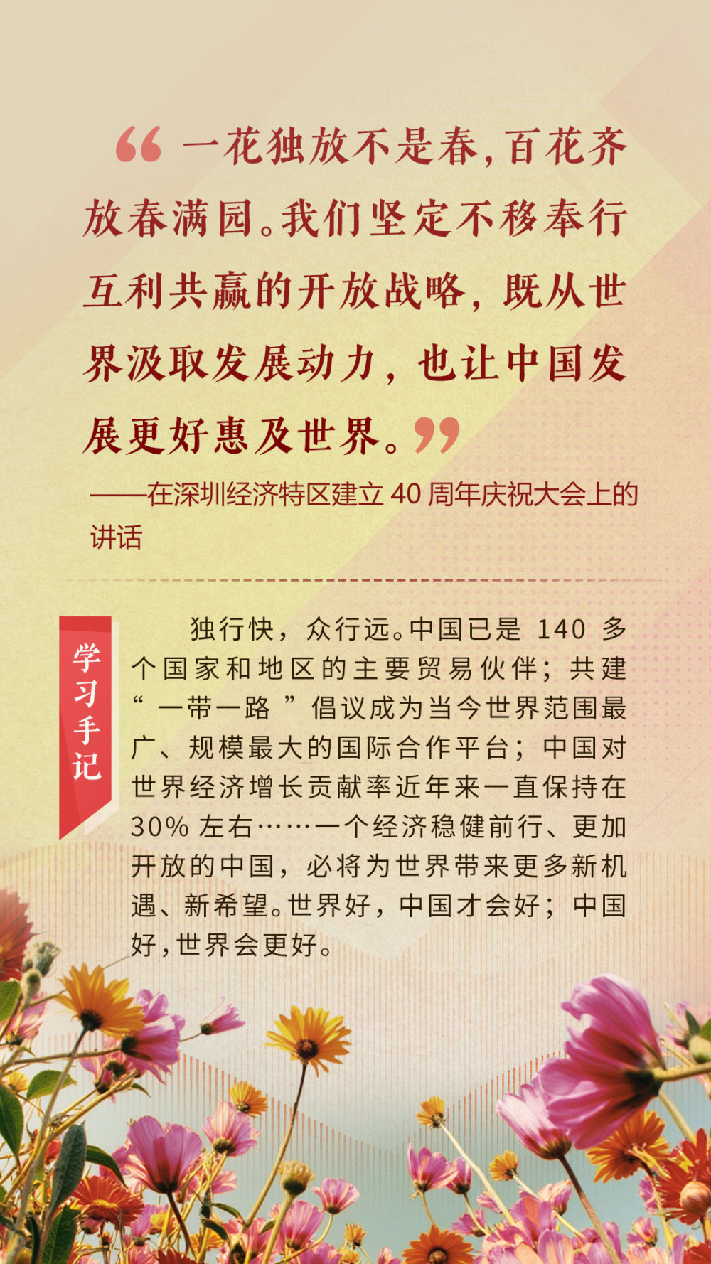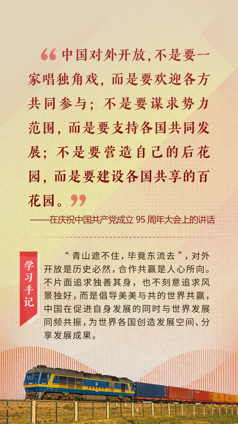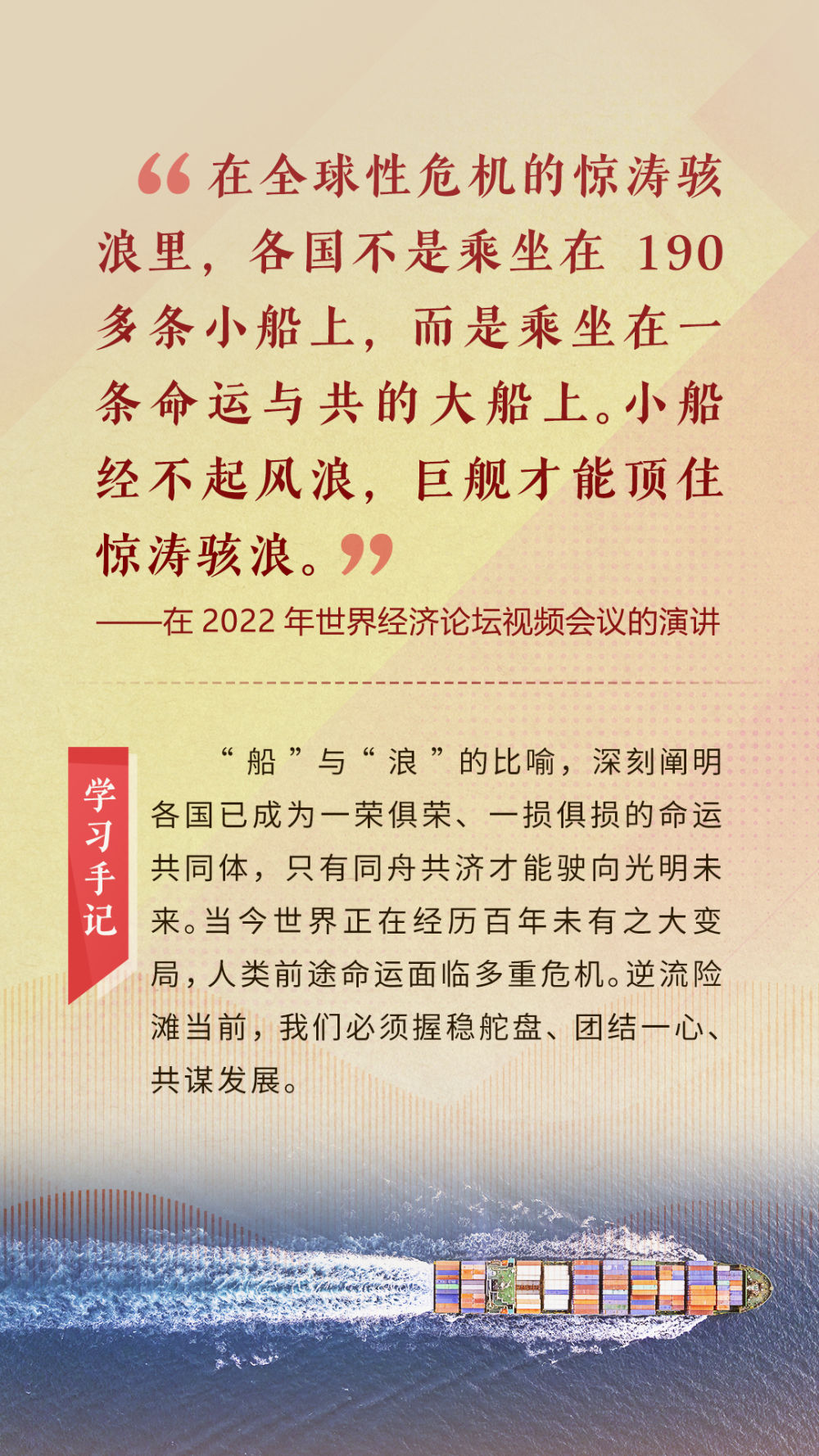 “天空足夠大,地球足夠大,世界也足夠大,容得下各國共同發(fā)展繁榮”“你中有我、我中有你的命運(yùn)共同體”“與中國同行就是與機(jī)遇同行”……習(xí)近平總書記一次次在重要場合發(fā)表重要講話,指引我們站在歷史正確的一邊,站在人類進(jìn)步的一邊,不畏浮云、登高望遠(yuǎn),不懼風(fēng)浪、勇毅前行。