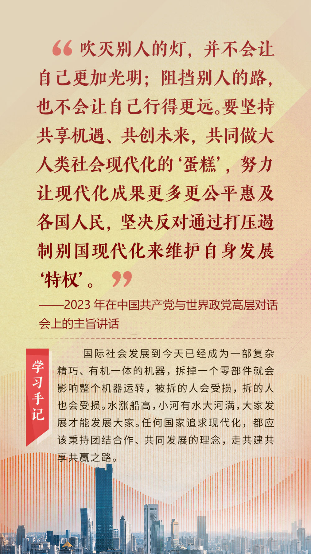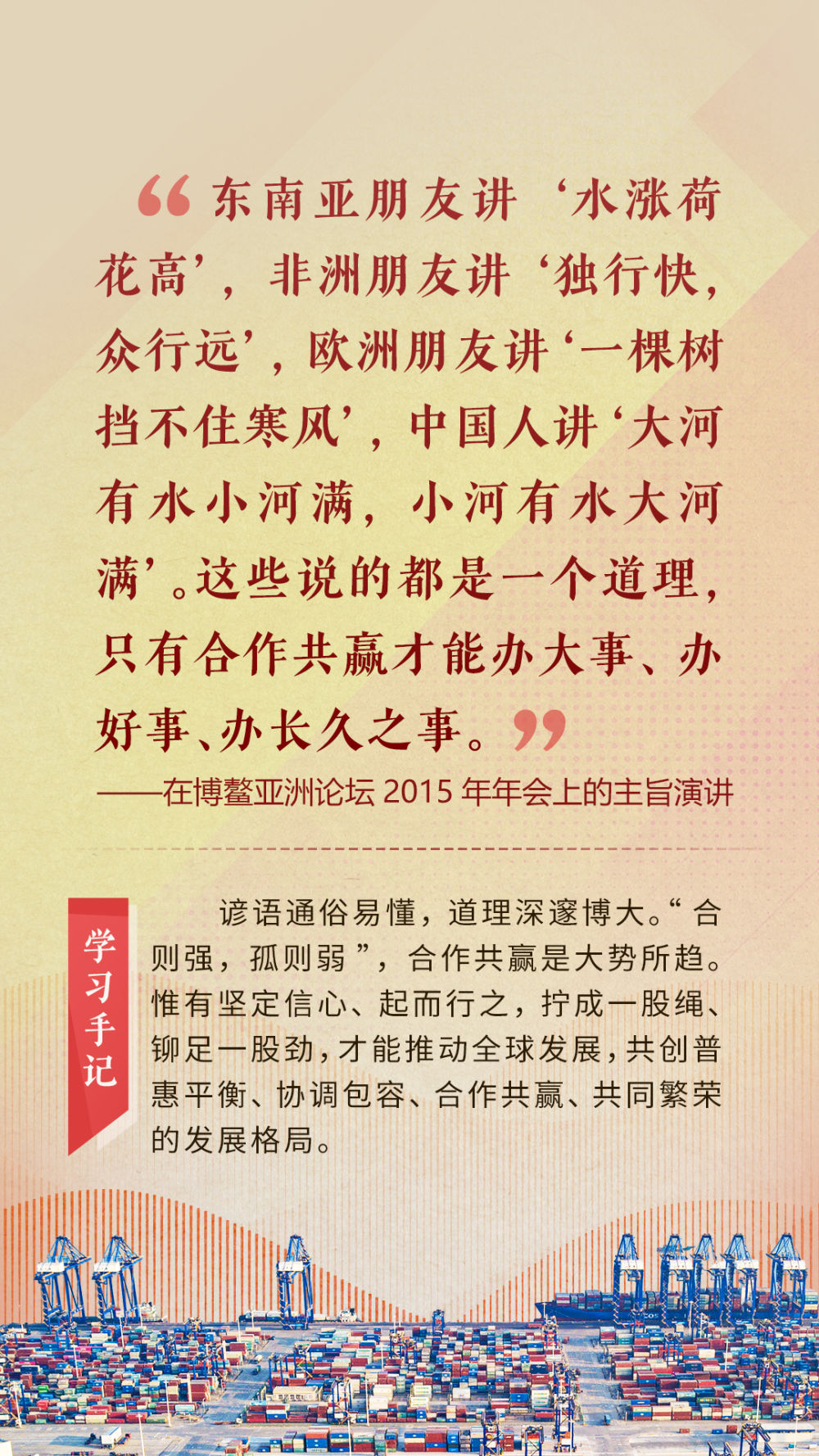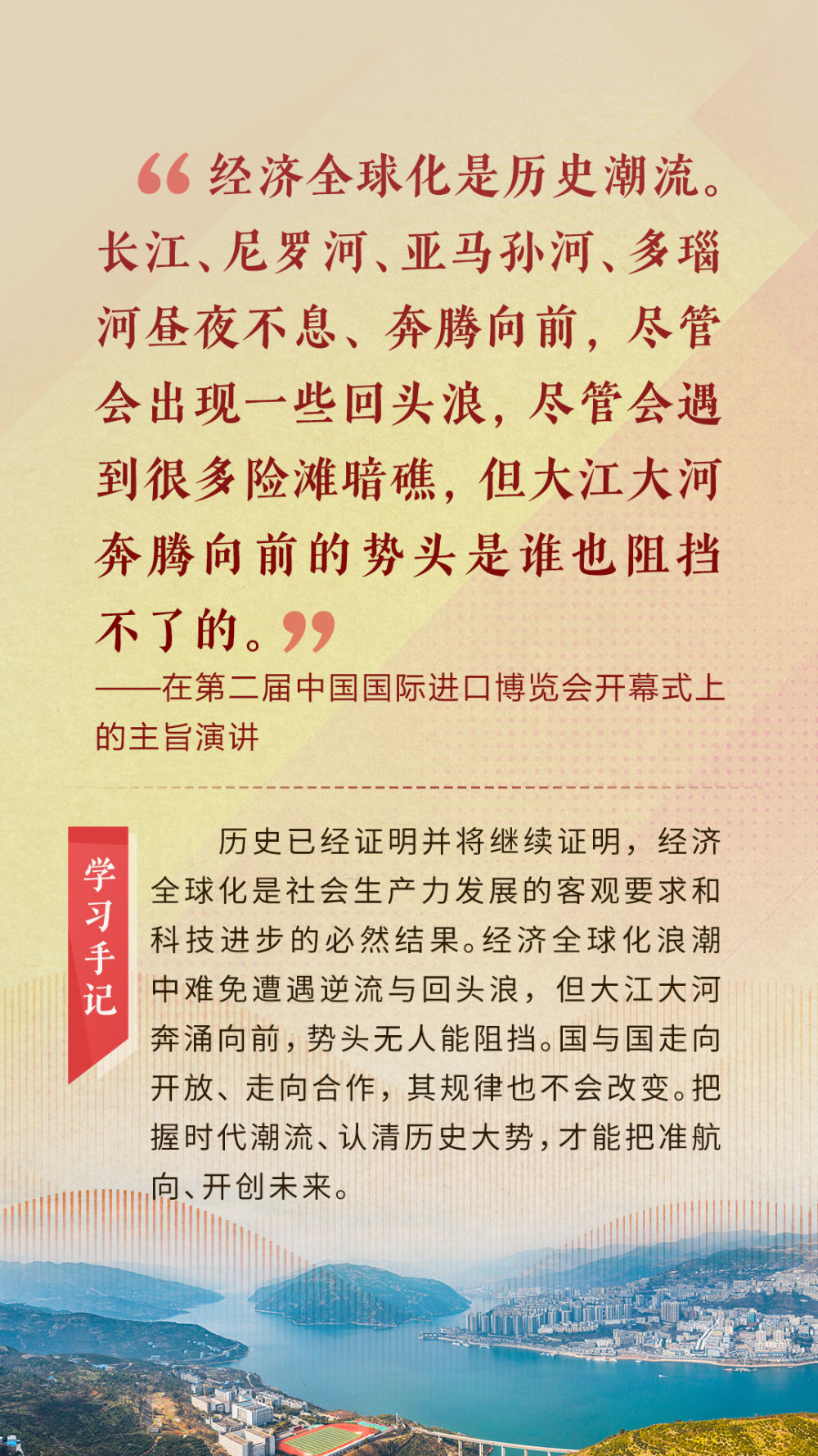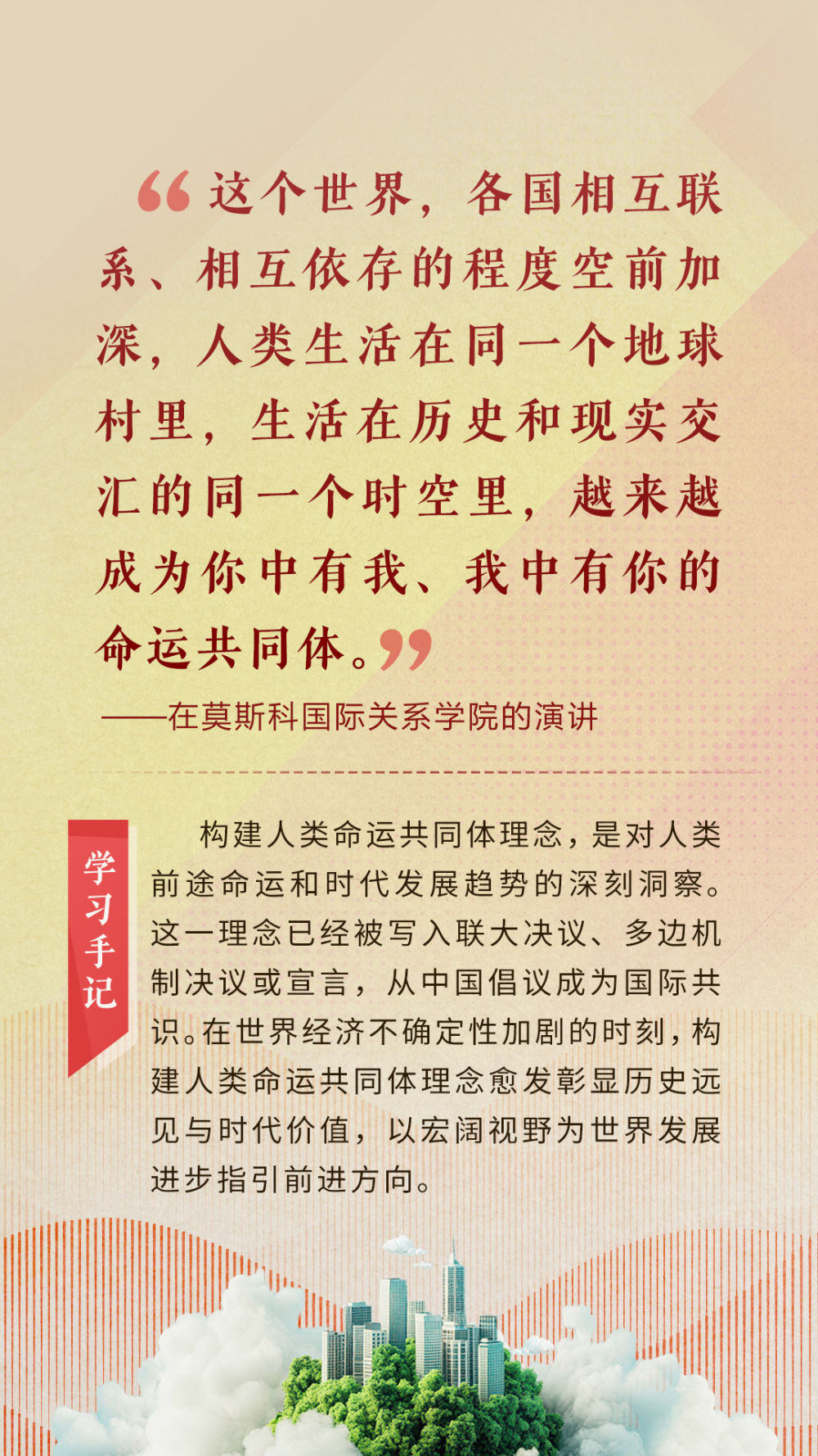 “天空足夠大,地球足夠大,世界也足夠大,容得下各國共同發(fā)展繁榮”“你中有我、我中有你的命運(yùn)共同體”“與中國同行就是與機(jī)遇同行”……習(xí)近平總書記一次次在重要場合發(fā)表重要講話,指引我們站在歷史正確的一邊,站在人類進(jìn)步的一邊,不畏浮云、登高望遠(yuǎn),不懼風(fēng)浪、勇毅前行。