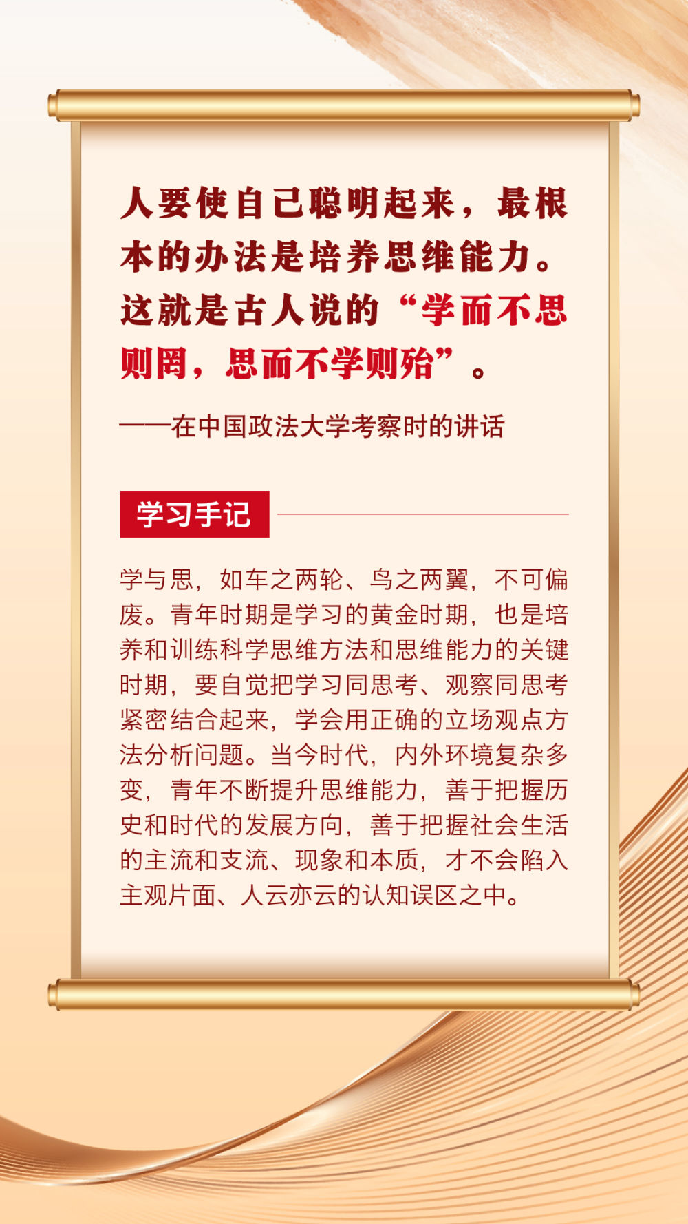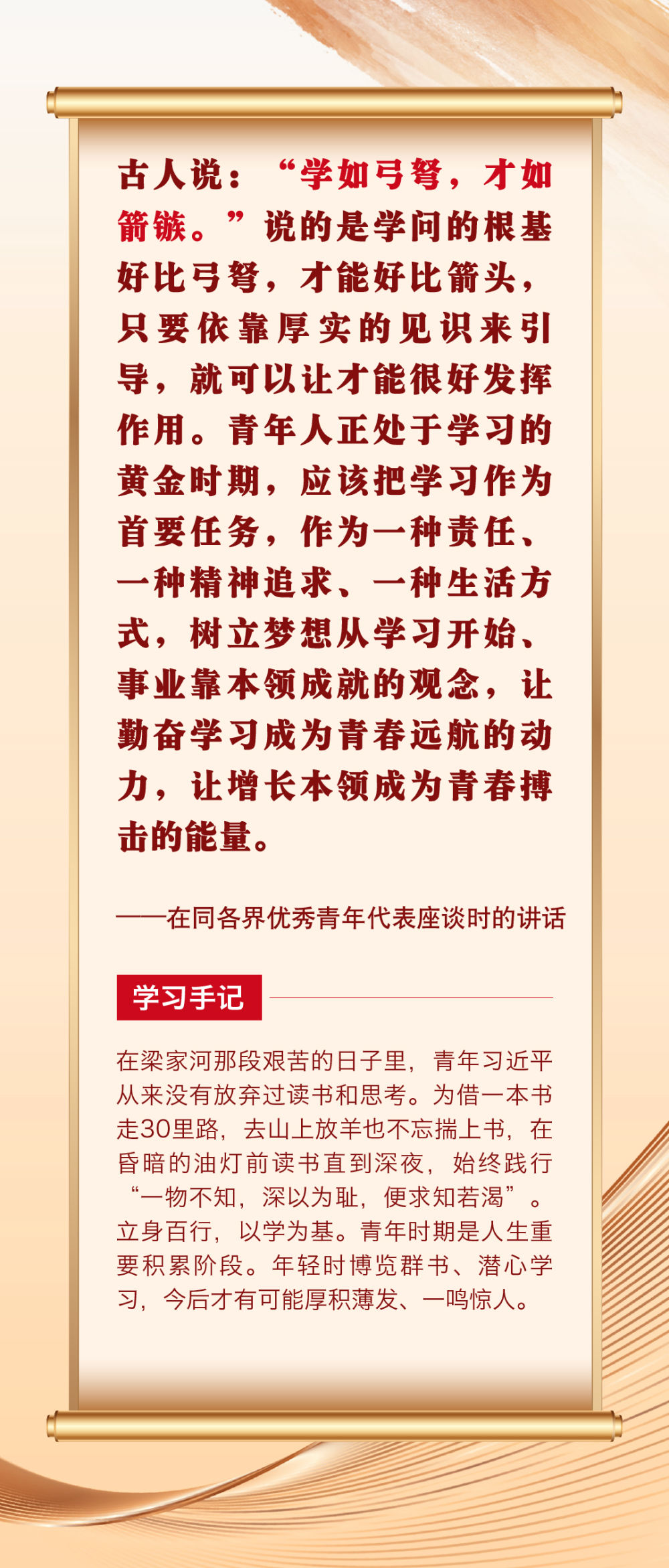 “青年者,國(guó)家之魂?!鼻嗄暌淮院畏N精神風(fēng)貌站上時(shí)代舞臺(tái),關(guān)乎祖國(guó)的明天、民族的未來(lái)。黨的十八大以來(lái),習(xí)近平總書記圍繞青年成長(zhǎng)成才作出許多重要論述。其中,有信手拈來(lái)的精妙典故,有貫古通今的廣征博引,引領(lǐng)廣大青年不斷在中華文化的浸潤(rùn)中堅(jiān)定中國(guó)心、涵養(yǎng)民族魂,成長(zhǎng)為堪當(dāng)復(fù)興重任的時(shí)代新人。