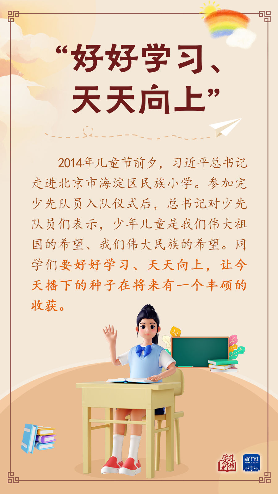 讓孩子們成長得更好,習(xí)近平總書記始終牽掛于心。本期“學(xué)習(xí)新語”,我們擷取總書記關(guān)心少年兒童健康成長的一些場景,感悟總書記對“祖國花朵”的真摯關(guān)懷和殷切期望。