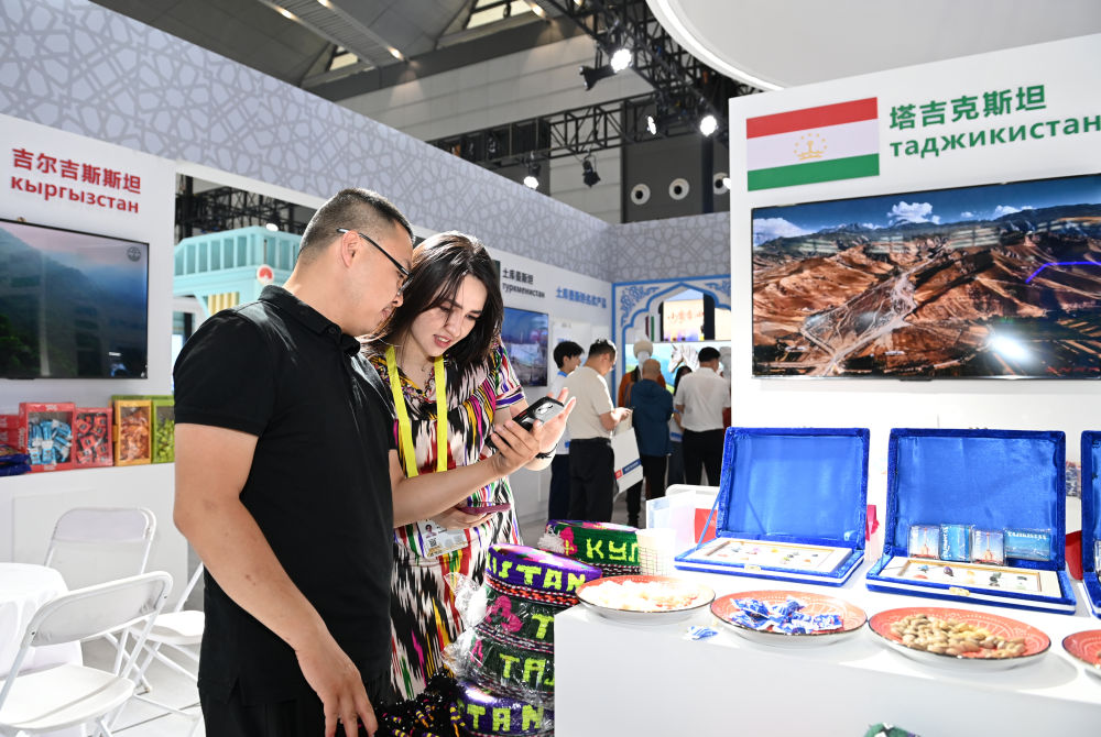 2025年5月21日,在第九屆絲綢之路國際博覽會暨中國東西部合作與投資貿易洽談會絲路優(yōu)品展上,參觀者了解塔吉克斯坦商品。新華社記者 李一博 攝
