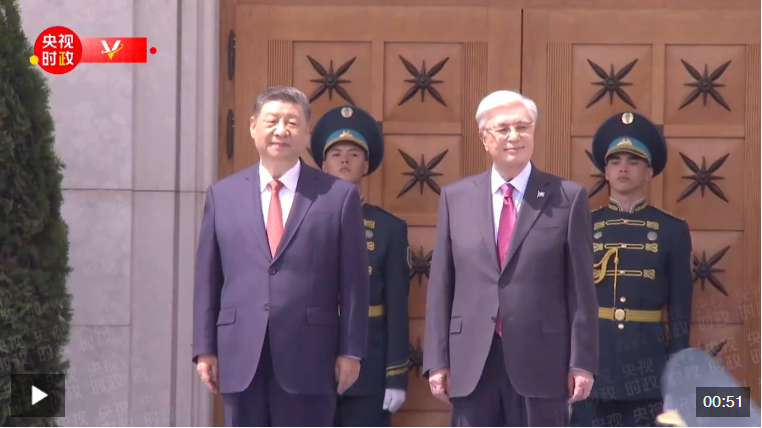 習近平抵達阿斯塔納納扎爾巴耶夫國際機場時,托卡耶夫總統(tǒng)率總統(tǒng)辦公廳主任達杰拜、副總理兼外長努爾特列烏、總統(tǒng)外事顧問卡濟漢、阿斯塔納市長卡瑟姆別克等高級官員熱情迎接。身著盛裝的哈薩克斯坦女青年向習近平獻花。禮兵分列藍地毯兩側(cè)致敬,哈薩克斯坦少年兒童手持中哈兩國國旗熱烈歡迎習近平到訪。習近平在托卡耶夫陪同下觀看儀仗隊分列式,直升機懸掛中哈國旗從機場上空飛過。在機場貴賓樓內(nèi),兩國元首還共同欣賞哈薩克斯坦少年兒童的文藝表演。