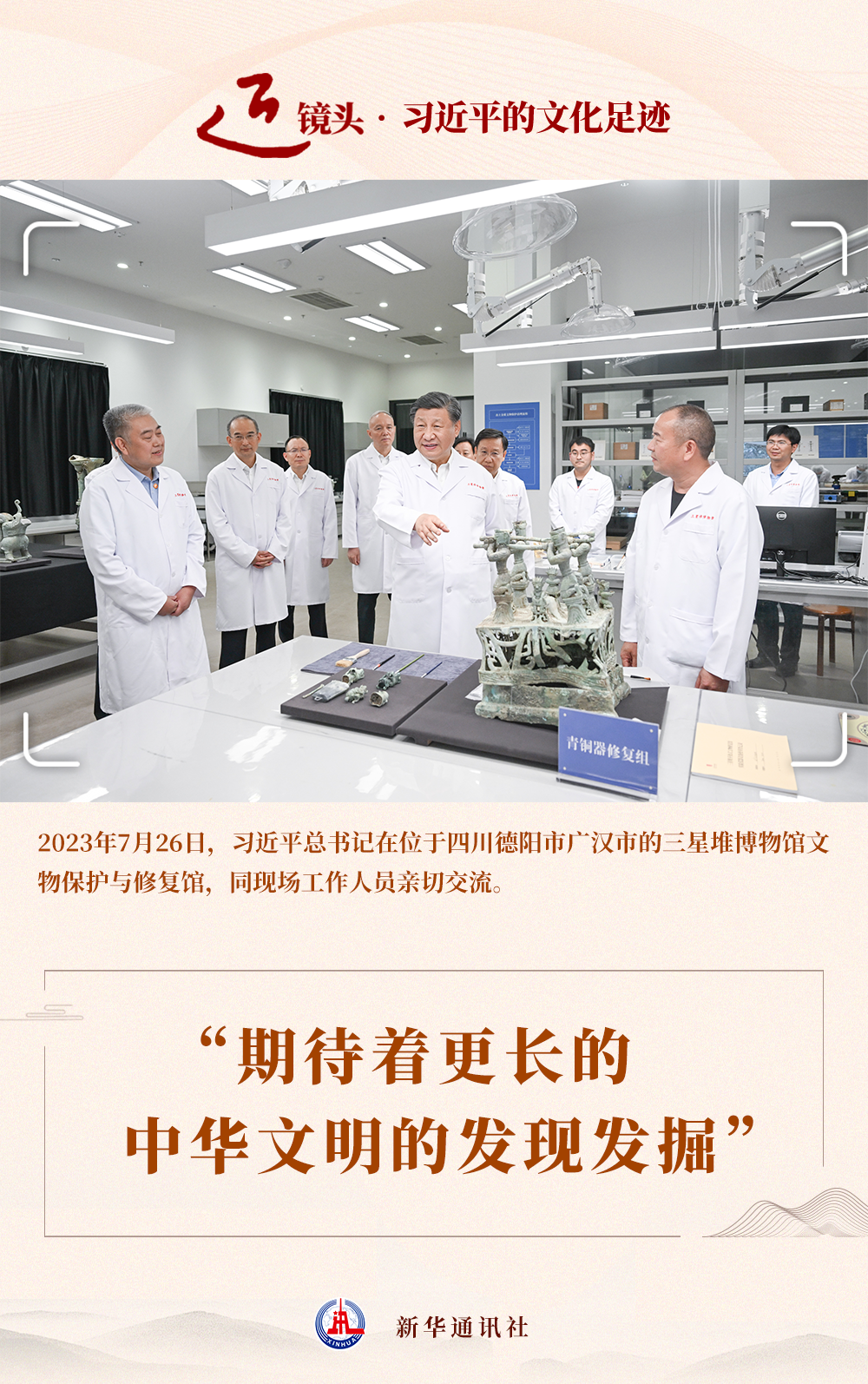 2023年7月26日,習(xí)近平總書(shū)記來(lái)到這里考察,對(duì)三星堆博物館新館的落成使用表示熱烈祝賀。