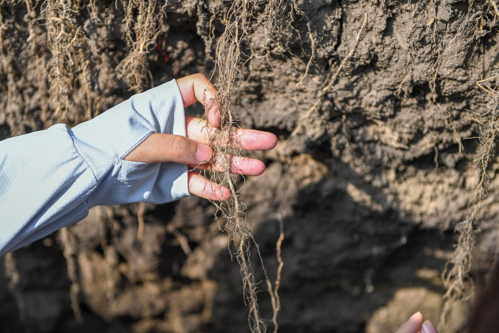 2023年7月31日,在位于吉林省四平市梨樹縣的中國農(nóng)業(yè)大學(xué)“科技小院”保護(hù)性耕作試驗(yàn)田,一名學(xué)生查看玉米根部在黑土中的生長情況。