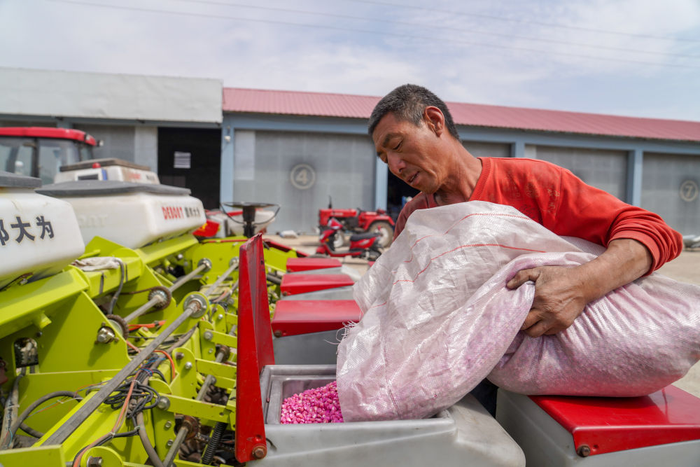 2020年5月7日,在吉林省四平市梨樹縣康達(dá)農(nóng)機(jī)農(nóng)民專業(yè)合作社,農(nóng)民向免耕播種機(jī)里投放玉米種子。