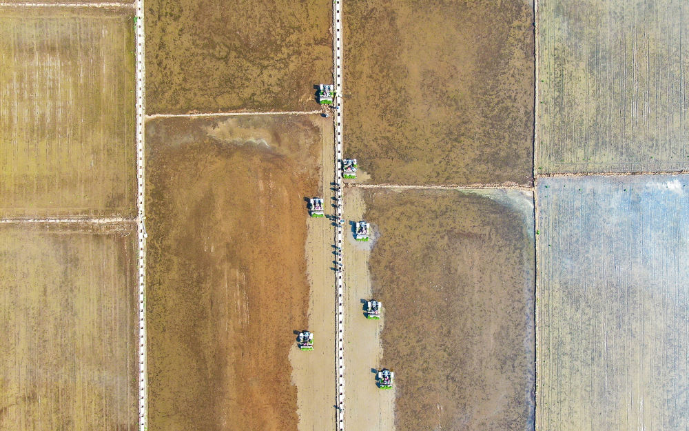 2022年5月13日,在遼寧省鐵嶺市鐵嶺縣新臺(tái)子鎮(zhèn),農(nóng)民駕駛農(nóng)機(jī)在稻田里插秧(無人機(jī)照片)。