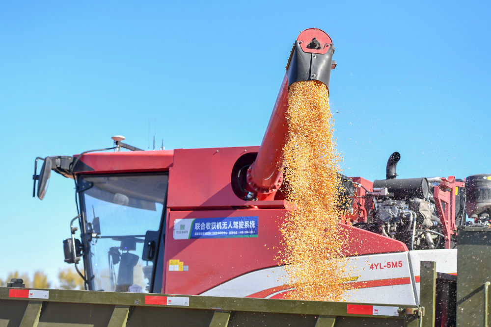 2023年10月19日,在中國科學(xué)院“黑土糧倉”科技會(huì)戰(zhàn)長春示范區(qū)公主嶺示范基地,無人駕駛農(nóng)機(jī)將收獲的玉米裝車。