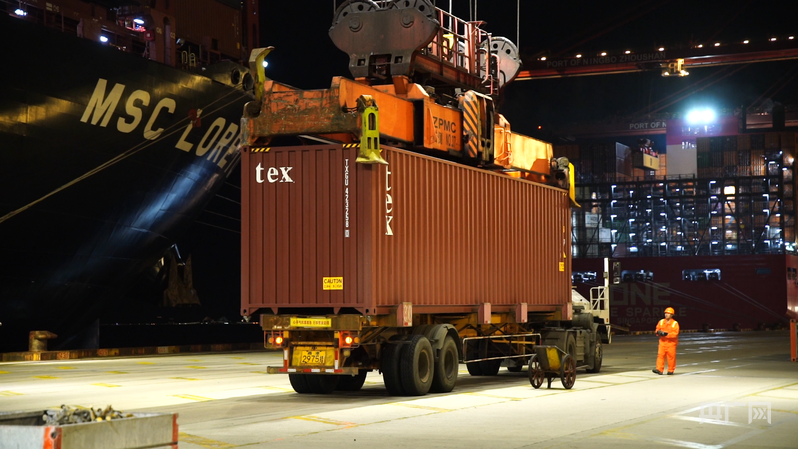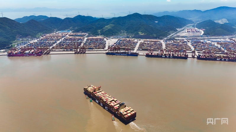 滿(mǎn)載貨物的“地中海洛雷托”號(hào)正緩緩靠泊寧波舟山港(央廣網(wǎng)記者 尚天宇 攝)