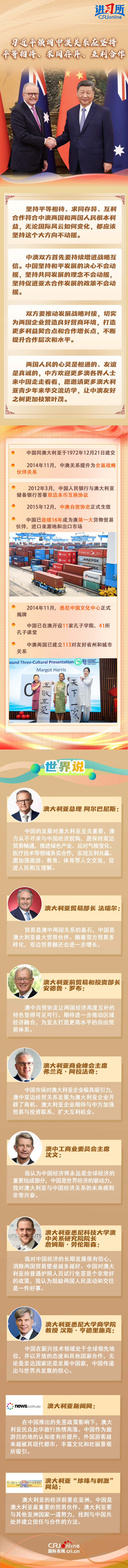 近年來,在雙方共同努力下,中澳關(guān)系走出低谷、實現(xiàn)轉(zhuǎn)圜,給兩國人民帶來了實實在在福祉。中澳全面戰(zhàn)略伙伴關(guān)系已經(jīng)開啟第二個10年,迎來又一個重要發(fā)展階段,澳方各界人士及媒體認(rèn)為,中國的發(fā)展對澳大利亞至關(guān)重要,澳大利亞要與其他亞洲國家一道努力,找到與中國共處并建立信任與合作的方法。