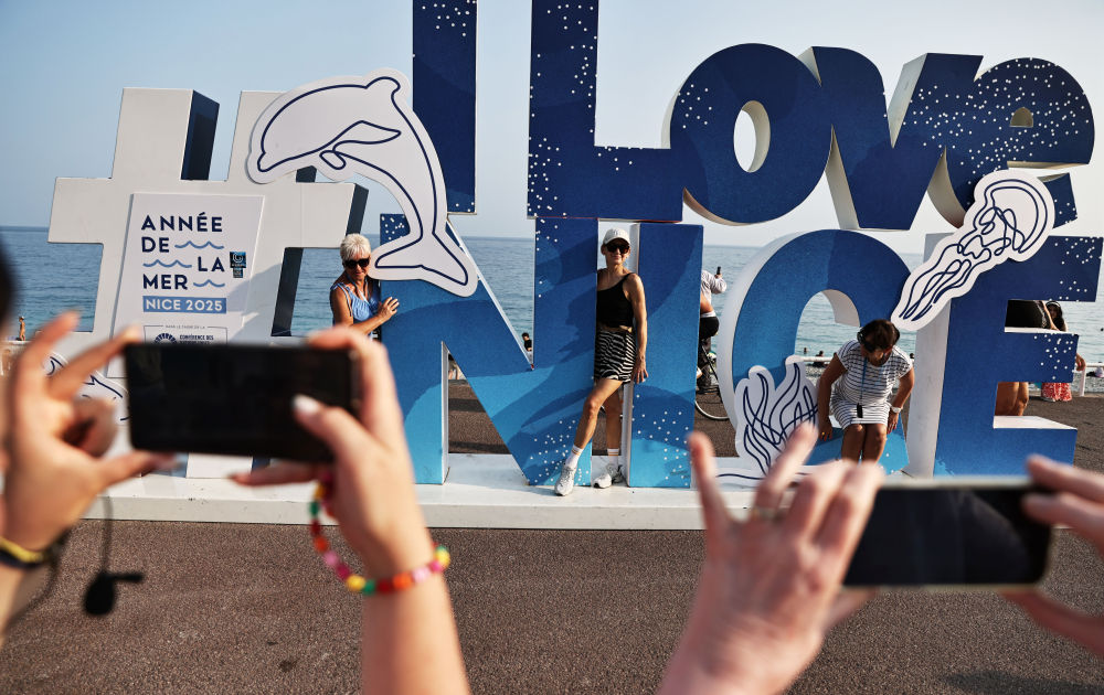 6月10日,在法國(guó)尼斯的盎格魯街上,人們?cè)趪?guó)際海洋年和第三屆聯(lián)合國(guó)海洋大會(huì)主題的景觀前拍照。新華社記者 高靜 攝