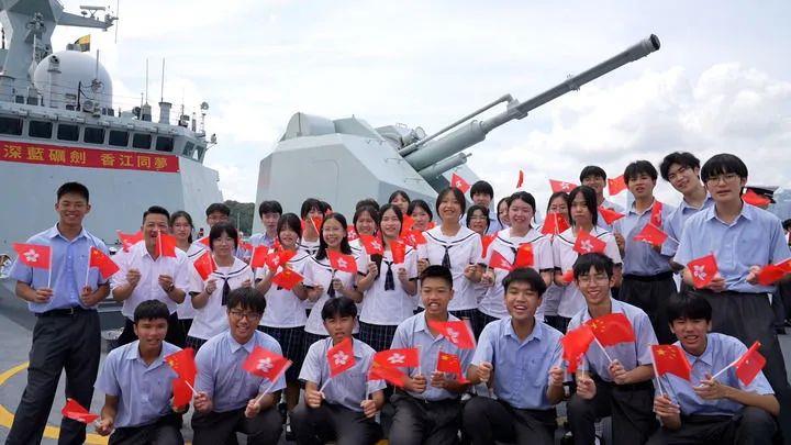 2025年7月3日,中國(guó)海軍山東艦航母編隊(duì)抵達(dá)香港。香港中學(xué)生登上海軍運(yùn)城艦參觀、留影。