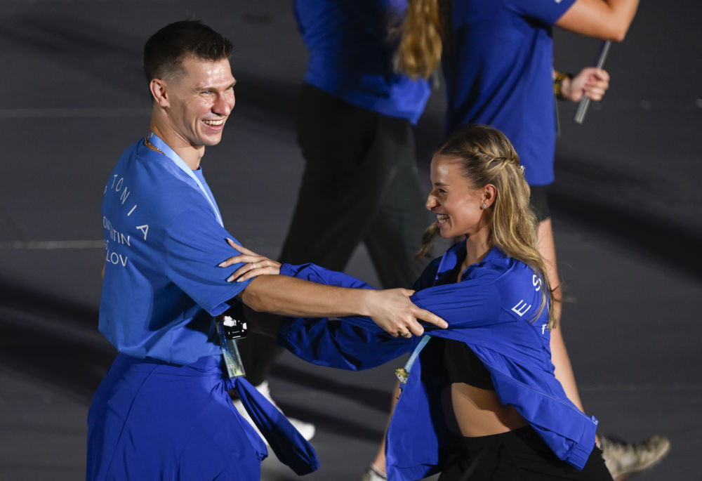 2025年8月7日,愛沙尼亞體育代表團(tuán)成員在第12屆世界運(yùn)動會開幕式上起舞。