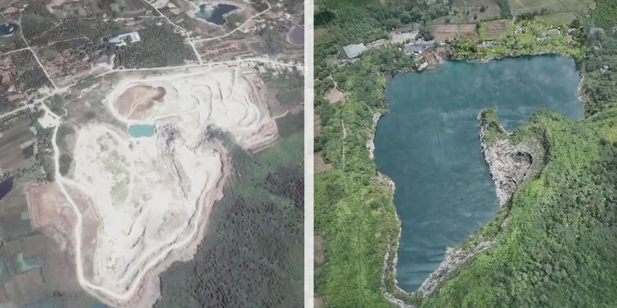 浙江安吉曾經(jīng)最大的石灰?guī)r礦坑復(fù)綠改造后,變成有山有水的生態(tài)度假區(qū)。