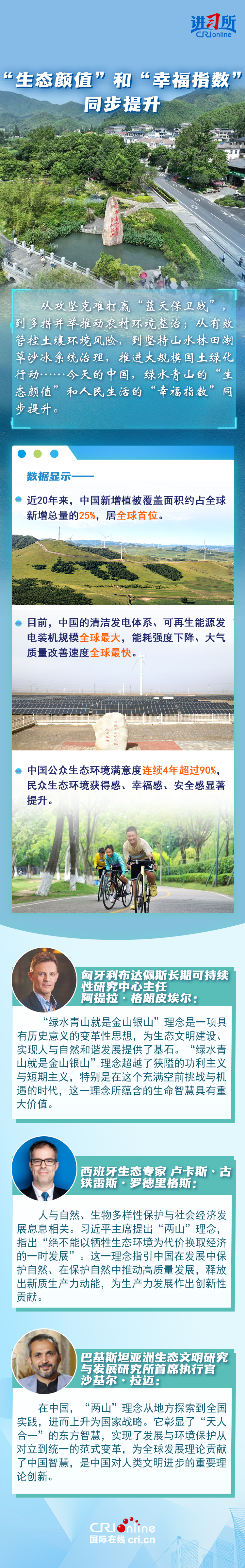 “從歷史長(zhǎng)河來(lái)看,如果說(shuō)我們這一代人能留給后人點(diǎn)什么,我看生態(tài)文明建設(shè)就是很重要的一個(gè)方面。生態(tài)文明建設(shè)最能給老百姓帶來(lái)獲得感,環(huán)境改善了,老百姓體會(huì)也最深?!?0年前,時(shí)任中共浙江省委書記的習(xí)近平在安吉余村考察時(shí),肯定了余村下定決心關(guān)閉礦區(qū)、全面走綠色發(fā)展之路的做法,并首次提出“綠水青山就是金山銀山”重要理念,20年來(lái),這一重要理念帶給中國(guó)大地一場(chǎng)革命性變化,直接推動(dòng)美麗中國(guó)建設(shè)取得歷史性成就。