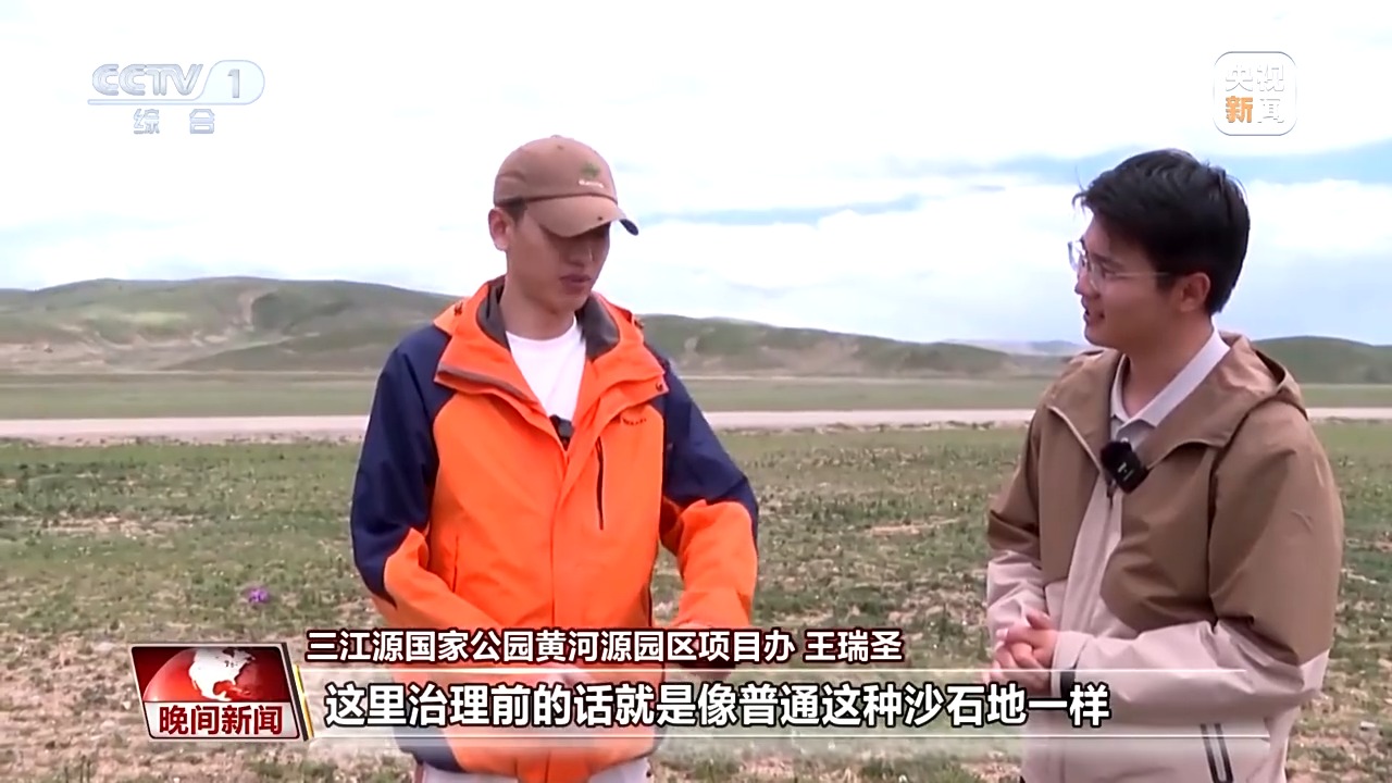 三江源國家公園黃河源園區(qū)項(xiàng)目干事 王瑞圣:這里治理前就像普通沙石地一樣,治理完的成效就是這樣子的,我們的草籽就在當(dāng)時切割的凹槽里面生長,這些草籽好多根部已經(jīng)進(jìn)行分裂了,所以會顯得非常茂密。