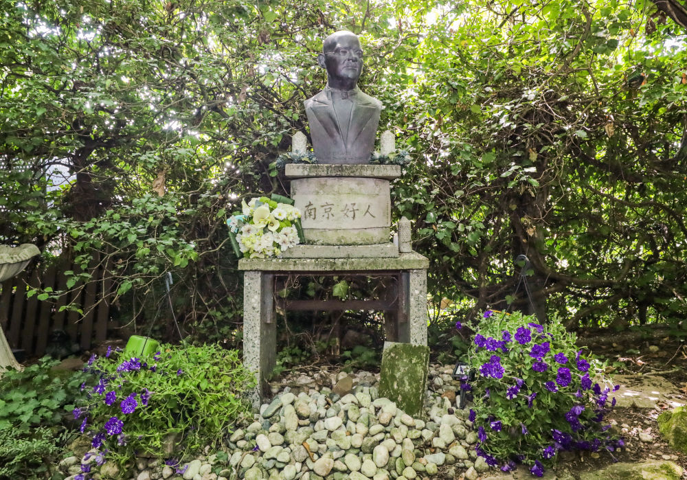 1950年,拉貝逝世,被安葬在柏林西郊。墓碑周圍是從南京移栽而來的竹子、梅花和菊花?;颁佊杏昊ㄊ?。墓碑前方矗立著拉貝半身雕像,其下立有紀念碑,用中德雙語鐫刻著:“感恩——永遠銘記拉貝先生的國際人道主義善舉!中國·南京?!蹦骨皵[放著憑吊者送上的簇簇鮮花。