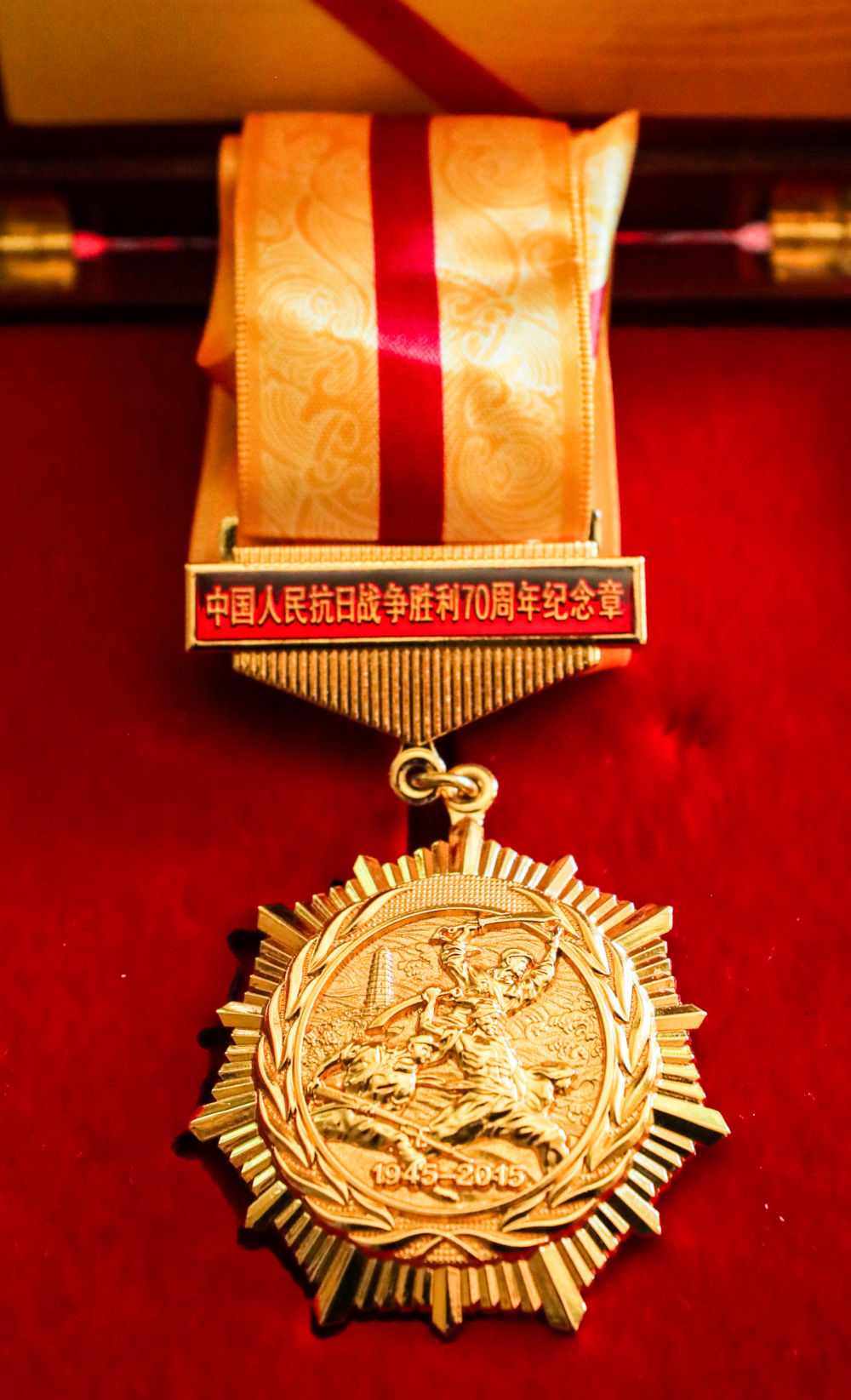 這是8月7日在德國海德堡約翰·拉貝交流中心拍攝的“中國人民抗日戰(zhàn)爭勝利70周年”紀念章。新華社記者 張帆 攝