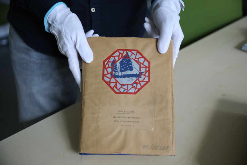 7月30日,在德國柏林的西門子歷史檔案館,歷史學家埃瓦爾德·布勒歇爾展示《拉貝日記》部分原件。新華社記者 杜哲宇 攝