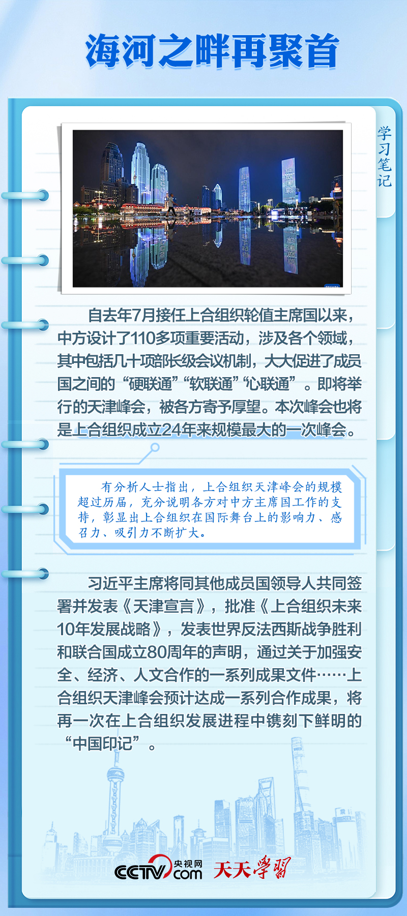 天天學(xué)習(xí)8月31日至9月1日,2025年上海合作組織峰會(huì)將在天津舉行。習(xí)近平主席將同20多位外國(guó)領(lǐng)導(dǎo)人和10位國(guó)際組織負(fù)責(zé)人聚首海河之濱,出席上合組織成立以來(lái)規(guī)模最大的一次峰會(huì)。