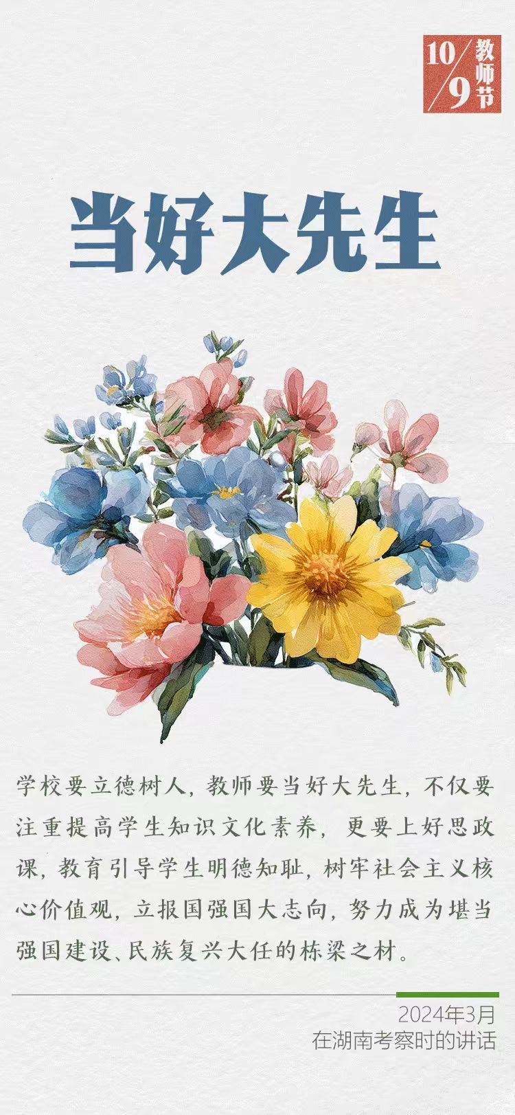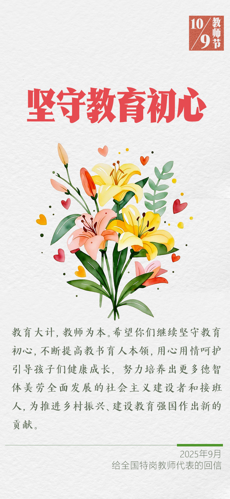 在第四十一個(gè)教師節(jié)到來(lái)之際,習(xí)近平總書(shū)記給全國(guó)特崗教師代表回信,提出殷切希望,并向全國(guó)廣大教師和教育工作者致以節(jié)日祝賀和誠(chéng)摯問(wèn)候。