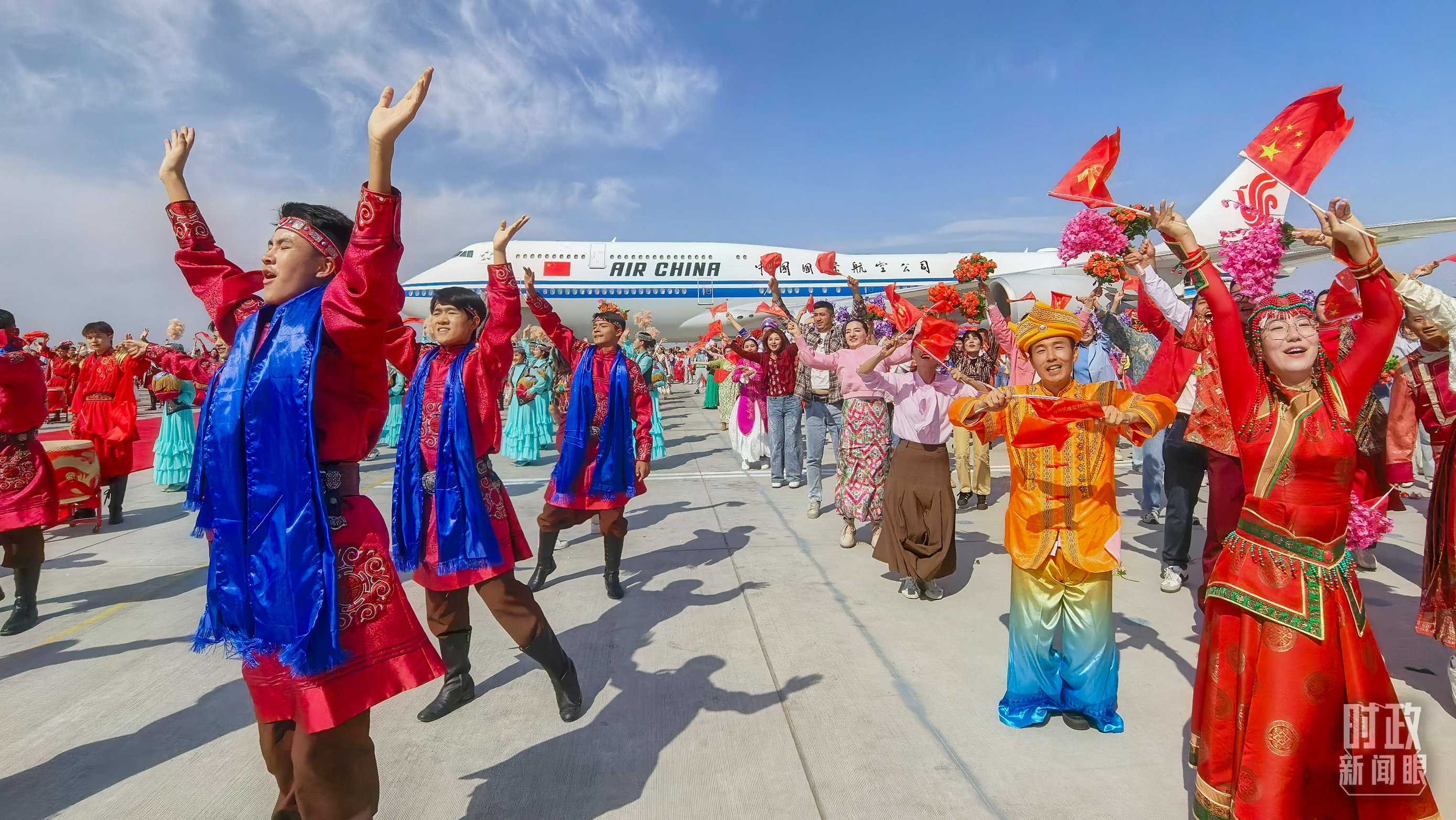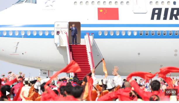 在機場,各族群眾代表身著民族服飾,載歌載舞。從機場到住地,各族群眾手持紅旗,熱情歡呼,表達對總書記的歡迎和感激之情。