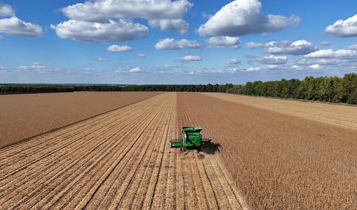 2025年9月19日,在北大荒集團(tuán)黑龍江格球山農(nóng)場有限公司大豆地塊,收獲機車在進(jìn)行收獲作業(yè)(無人機照片)。新華社發(fā)(陸文祥攝)