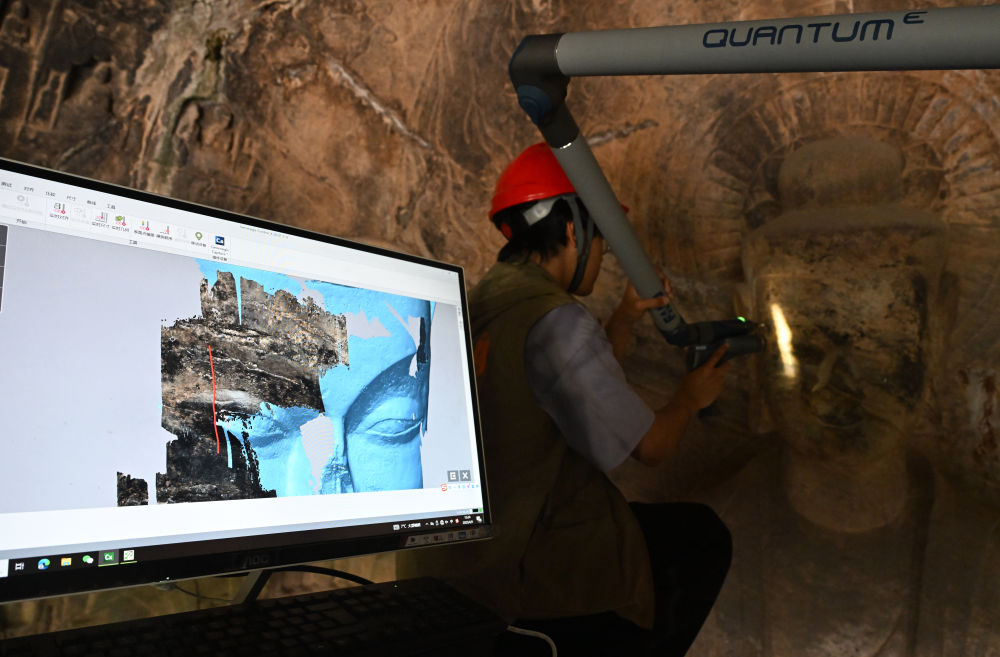 2025年4月9日,武漢大學文化遺產(chǎn)智能計算實驗室團隊成員在河南洛陽龍門石窟魏字洞使用關(guān)節(jié)臂掃描儀對佛像進行數(shù)字化掃描。從2005年起,龍門石窟研究院開始為龍門石窟建立數(shù)字化檔案,借助激光掃描、高清攝影等技術(shù)手段收集文物數(shù)據(jù),以數(shù)字的形式留存千年石刻群的風貌,致力于讓這一規(guī)模宏大、氣勢磅礴的石窟瑰寶“芳華永駐”。