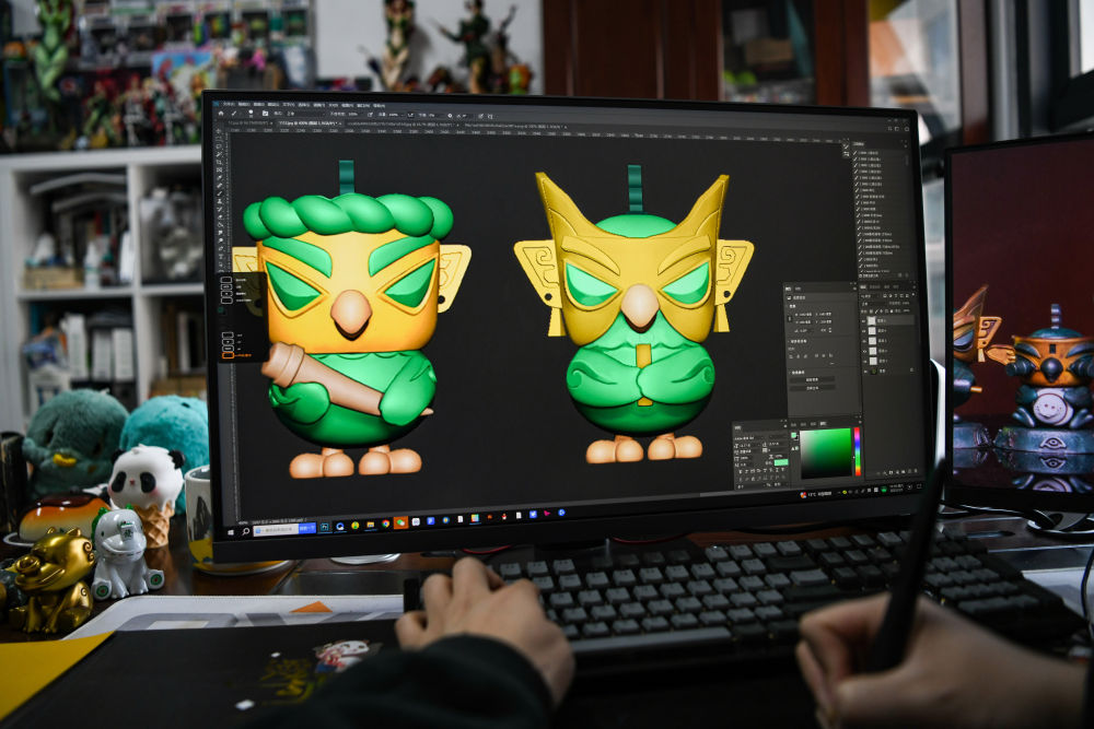 2025年3月1日,文創(chuàng)產(chǎn)品策劃運營師曾舟在位于四川成都的辦公室內(nèi)完善文創(chuàng)產(chǎn)品細節(jié)。他以三星堆青銅神樹、青銅縱目面具、青銅獸面等文物為創(chuàng)作藍本,結(jié)合潮玩元素設(shè)計的文創(chuàng)作品廣受歡迎。“我想做的不是玩具快消品,而是有內(nèi)容、有溫度、有意義的文化IP,讓年輕一代隨手摸到沉淀千年的文化?!痹壅f。