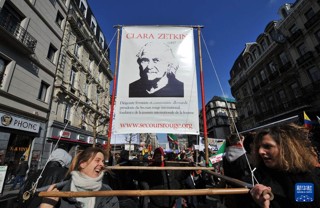 2010年3月6日,在比利時(shí)首都布魯塞爾,婦女代表抬著著名女政治活動(dòng)家、三八國(guó)際婦女節(jié)的倡導(dǎo)者克拉拉·蔡特金的畫像參加慶祝三八國(guó)際勞動(dòng)?jì)D女節(jié)游行。新華社記者 武巍 攝
