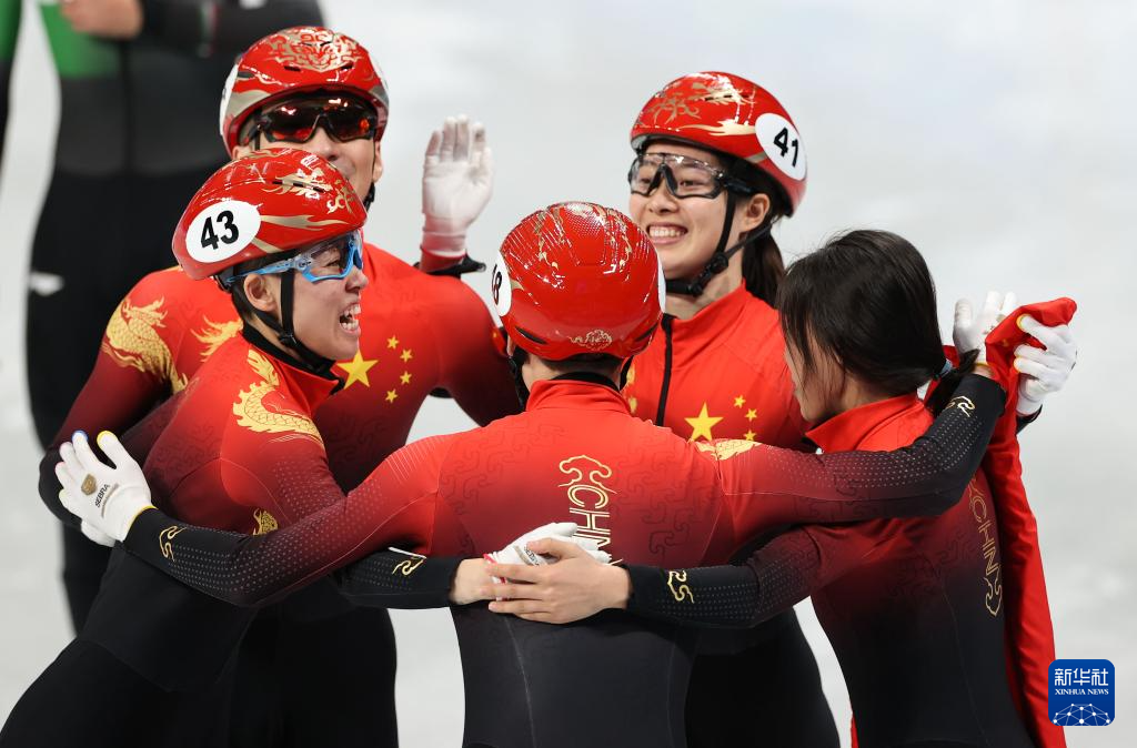 2022年2月5日,在首都體育館舉行的北京2022年冬奧會(huì)短道速滑項(xiàng)目混合團(tuán)體接力決賽中,中國(guó)隊(duì)奪得冠軍。這是中國(guó)隊(duì)選手在比賽后慶祝。新華社記者 楊磊 攝
