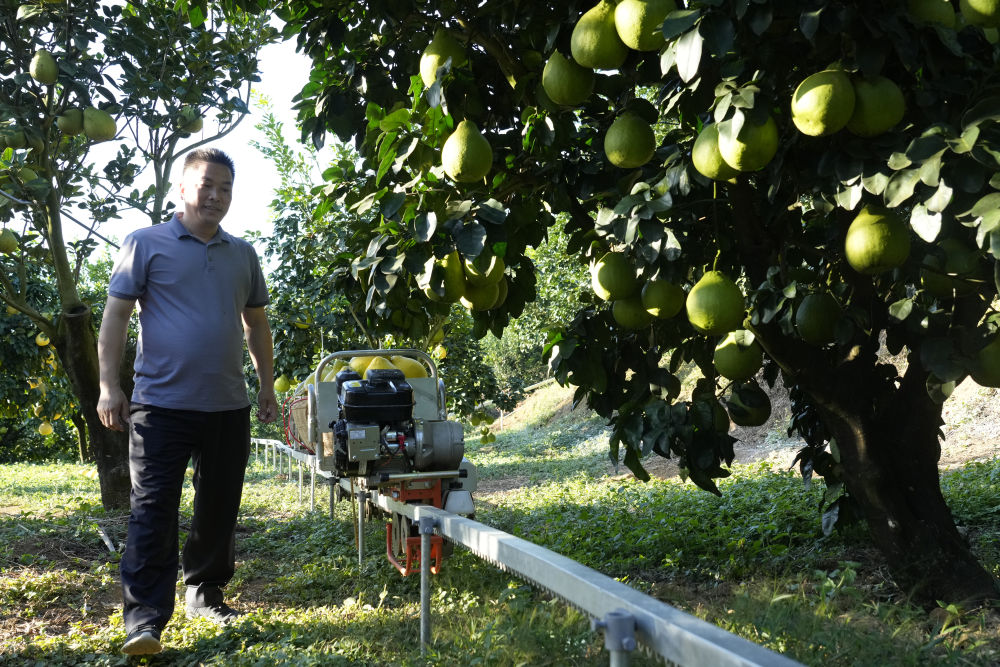 2025年11月7日,在梅州南福金柚種植基地,柚農(nóng)通過山地運輸車運輸柚子。