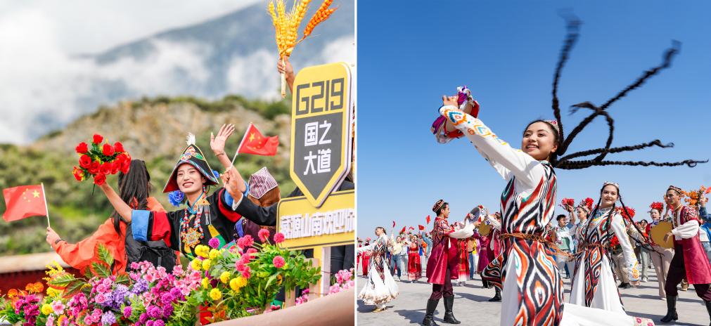 左圖:2025年8月21日上午,彩車上的演員通過西藏拉薩市布達拉宮廣場時向人群揮手,熱烈慶祝西藏自治區(qū)成立60周年。