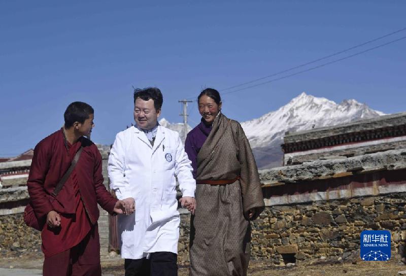 2020年1月17日,王文濤(中)在甘孜州回訪他治愈的包蟲病患者。新華社記者 劉坤 攝