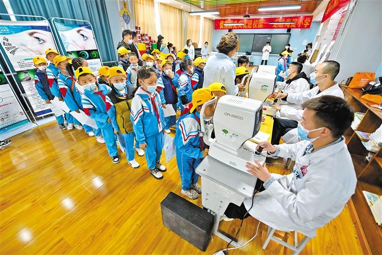 圖為醫(yī)護人員利用專業(yè)儀器為學(xué)生開展視力檢查。記者 唐斌 攝