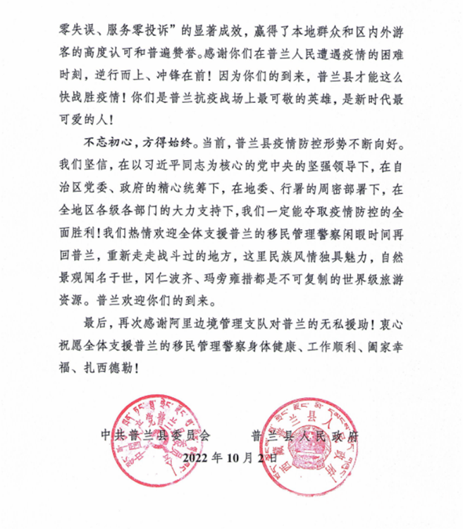 中國西藏網訊 “普蘭縣發(fā)生新冠肺炎疫情后,阿里邊境管理支隊第一時間選派精干力量支援普蘭疫情防控工作,為打贏疫情防控阻擊戰(zhàn)、攻堅戰(zhàn)發(fā)揮了至關重要的作用?!?0月2日,西藏自治區(qū)阿里邊境管理支隊收到一封來自阿里地區(qū)普蘭縣委的感謝信。信中對阿里邊境管理支隊戰(zhàn)“疫”一線民警在一個多月的疫情防控工作中,克服困難、勇于擔當、不分晝夜、持續(xù)奮戰(zhàn)的抗疫工作表達了感謝,給予了肯定。