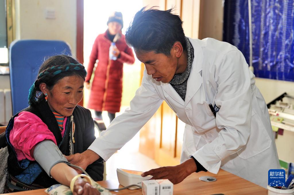 圖為全科醫(yī)生旺扎在為一名農(nóng)牧民測(cè)量血壓(2018年1月14日攝)。新華社記者張汝鋒 攝