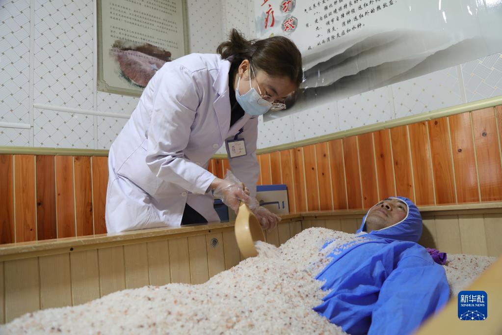 1月27日,在青海省海南藏族自治州貴德縣常牧鎮(zhèn)中心衛(wèi)生院藏醫(yī)館,護(hù)士給患者做鹽浴治療。新華社記者 央秀達(dá)珍 攝