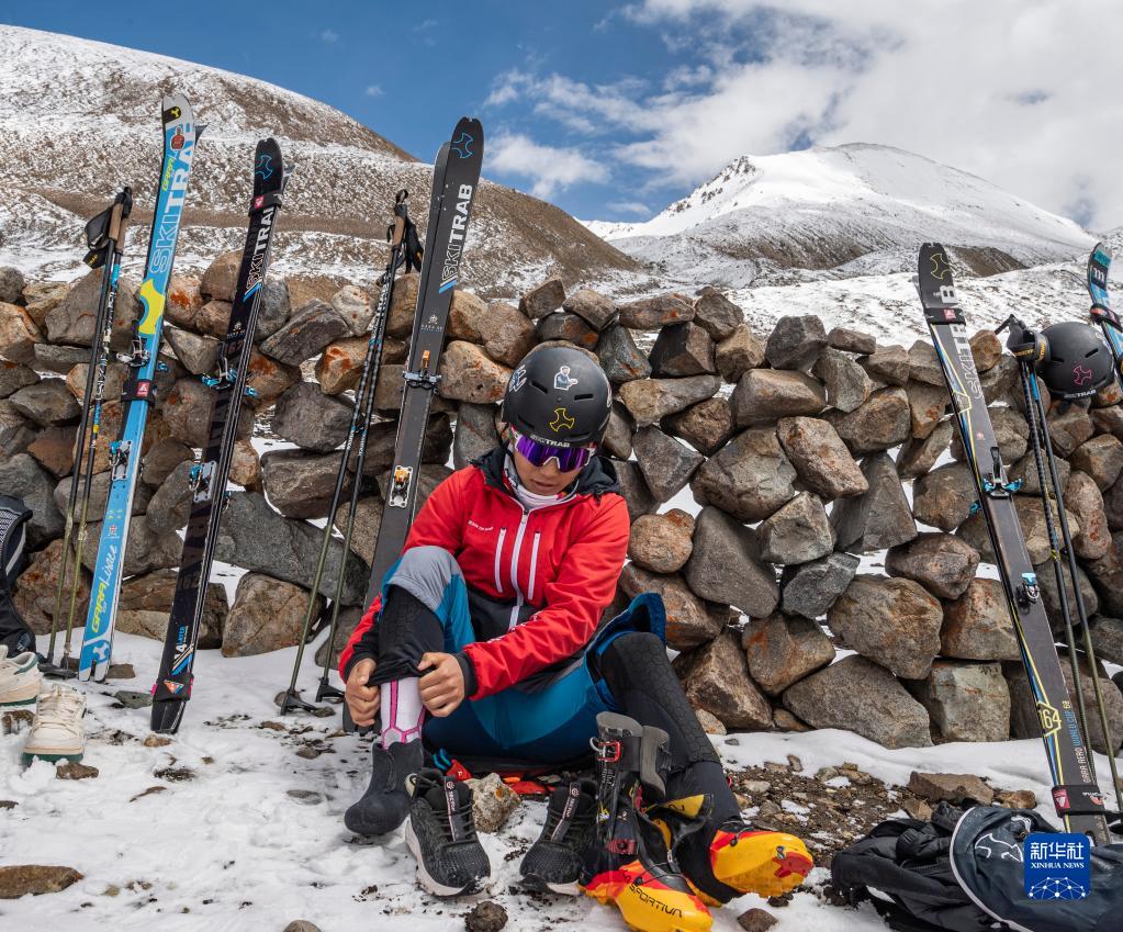 在西藏拉薩市當(dāng)雄縣羊八井鎮(zhèn),玉珍拉姆在訓(xùn)練前為雪板粘貼止滑帶(5月2日攝)。新華社記者 孫非 攝