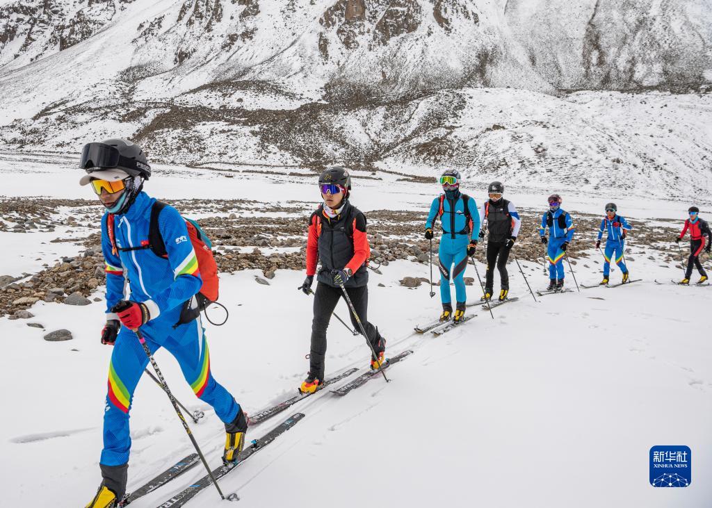 在西藏拉薩市當(dāng)雄縣羊八井鎮(zhèn),玉珍拉姆(左二)和隊(duì)友進(jìn)行滑雪登山訓(xùn)練(5月2日攝)。新華社記者 孫非 攝