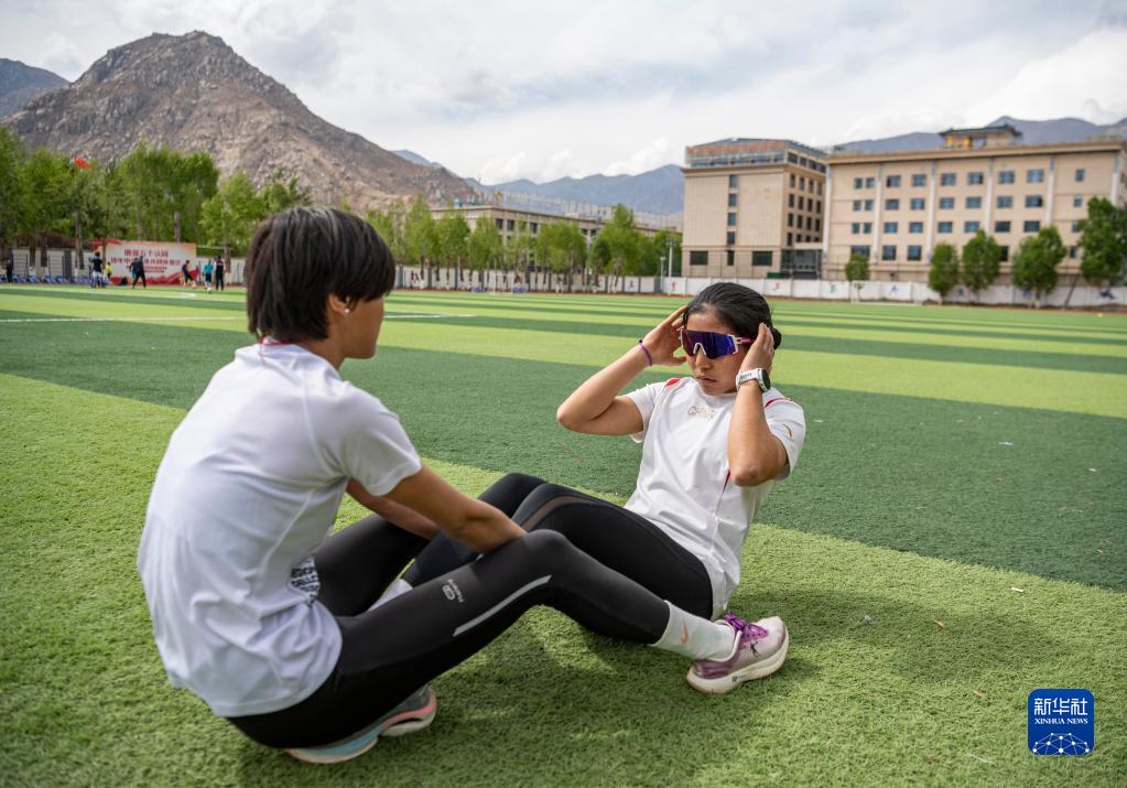 在西藏自治區(qū)體育運(yùn)動(dòng)技術(shù)學(xué)校,玉珍拉姆(左)和隊(duì)友次旦玉珍在訓(xùn)練后聊天(4月29日攝)。新華社記者 孫非 攝