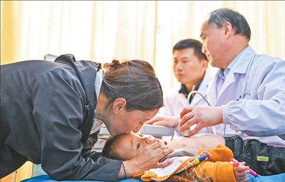 西藏山南市措美縣中心醫(yī)院,來自安徽醫(yī)科大學(xué)第一附屬醫(yī)院的醫(yī)生在為兒童做先心病篩查。程 兆攝(影像中國)