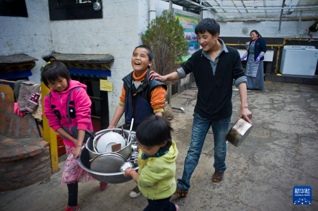 2013年10月12日,達(dá)瓦次仁(左二)跟同學(xué)們將洗好的餐具抬回廚房。