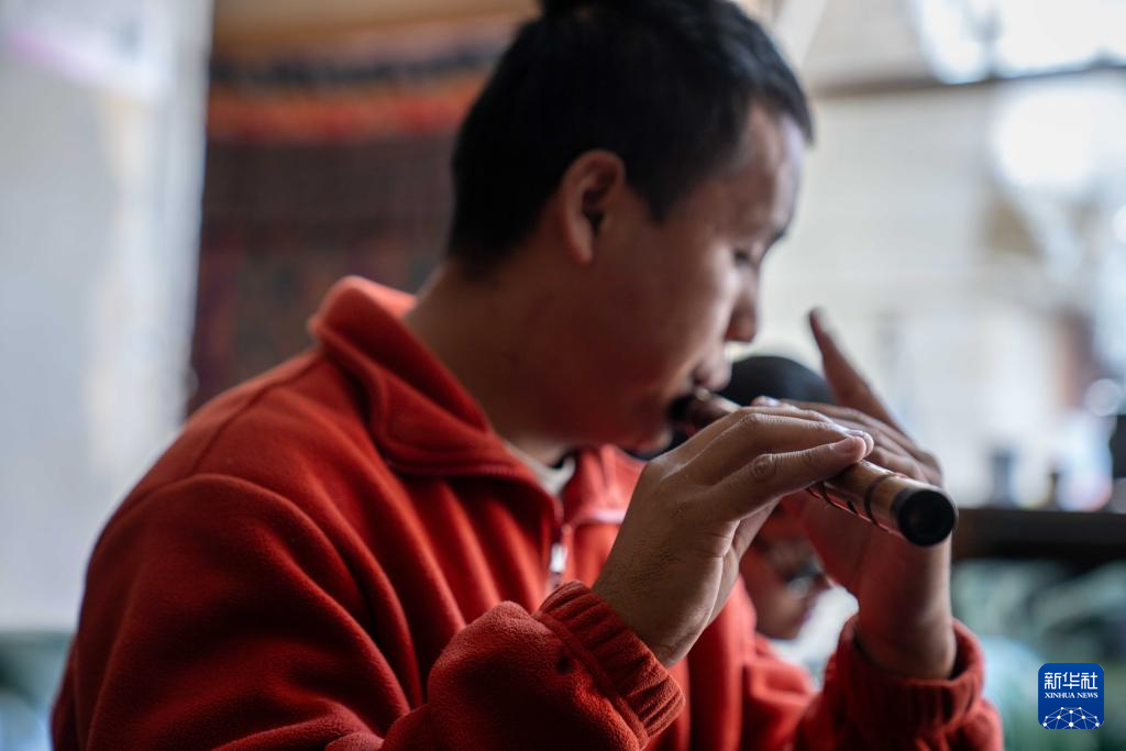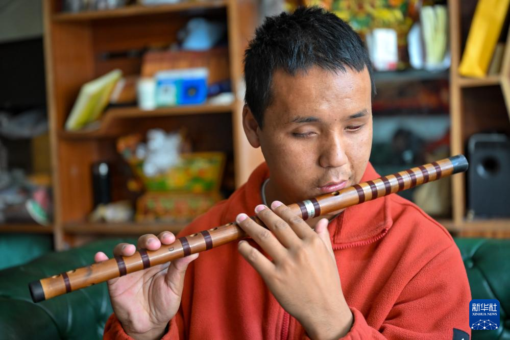 2025年10月10日,達(dá)瓦次仁在練習(xí)吹奏笛子。