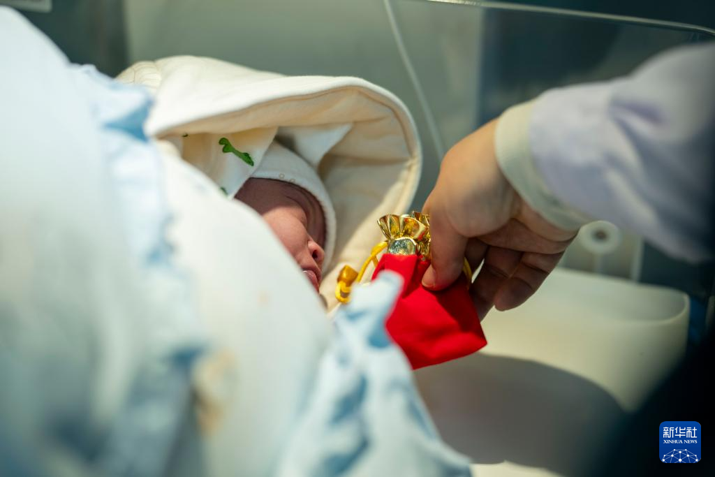 2026年1月1日,西藏自治區(qū)人民醫(yī)院助產(chǎn)士趙粒給新生寶寶福袋。新華社記者 旦增尼瑪曲珠 攝