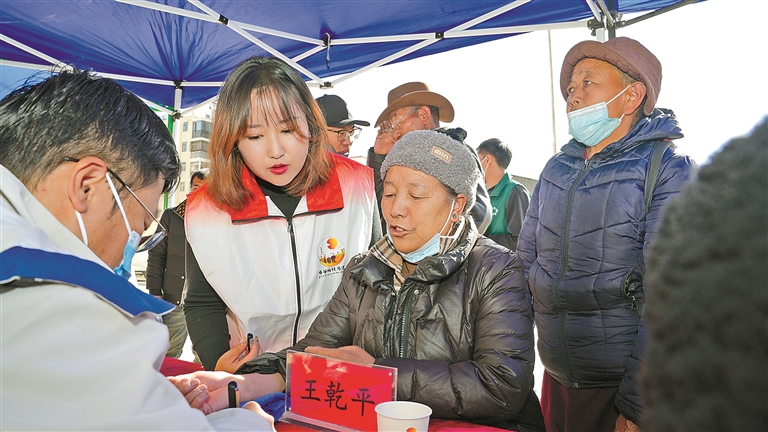 為進(jìn)一步深化社區(qū)養(yǎng)老服務(wù)體系建設(shè),切實(shí)回應(yīng)老年人的健康關(guān)切,近年來,城關(guān)區(qū)奪底街道桑伊社區(qū)聚焦重點(diǎn)服務(wù)群體,創(chuàng)新探索“黨建引領(lǐng)+志愿服務(wù)+專業(yè)醫(yī)養(yǎng)”三位一體助老服務(wù)新模式,取得良好成效。圖為三沐醫(yī)養(yǎng)專業(yè)人員與桑伊社區(qū)“布谷響鈴”志愿者協(xié)同配合,為轄區(qū)老年人免費(fèi)開展健康指標(biāo)監(jiān)測。記者 鹿麗娟 攝