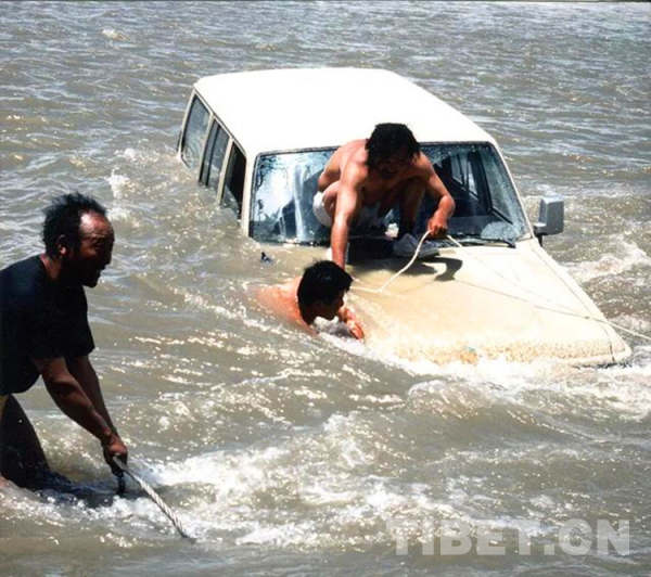 圖為1994年,李永憲(中)、丹扎(左)、旺堆次仁在拯救翻進河水中的考古隊的車