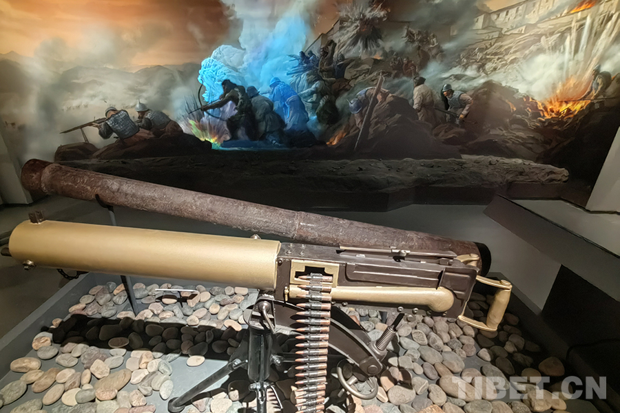 圖為宗山號角——紀(jì)念西藏江孜抗英保衛(wèi)戰(zhàn)120周年主題展現(xiàn)場,英軍當(dāng)時使用的馬克沁機(jī)槍模型(前),藏軍使用的土炮(后),背景為相關(guān)歷史場景的視覺還原。馬克沁機(jī)槍是全自動機(jī)槍,也是當(dāng)時殺傷力較大的武器,理論射速達(dá)600發(fā)/分鐘 攝影:楊月云