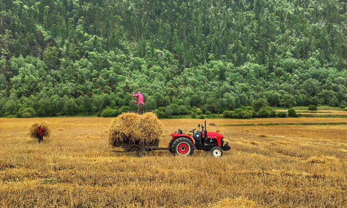 秋天是收獲的季節(jié),農牧民把收獲的青稞秸稈裝上拖拉機。